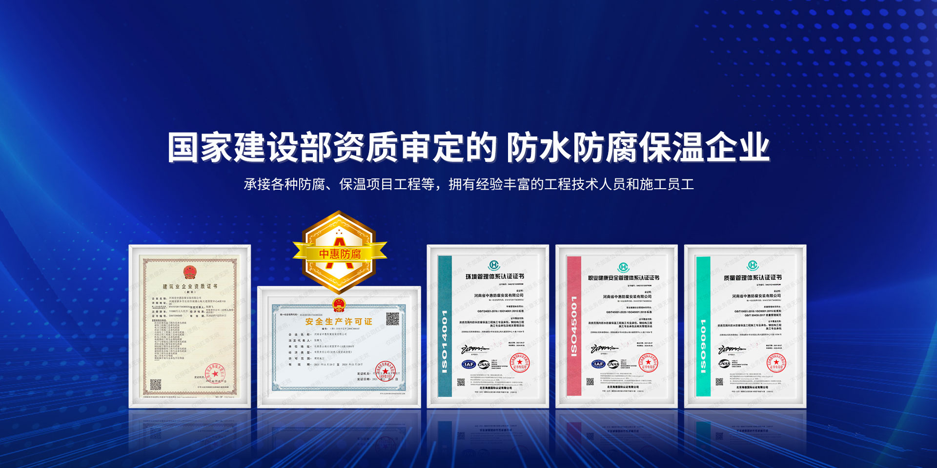 公司經營范圍:防水防腐保溫工程;消防設施工程;建筑裝修裝飾工程;建筑機電安裝工程;電力工程;建筑工程;石油化工工程;工業清洗工程;油罐清洗工程;鋼結構工程;環保工程;模板腳手架工程;電纜防火封堵、防污閃噴涂、外墻外保溫工程;各類施工勞務作業;設備維修、船舶鉚焊、涂裝;電力工程材料、建材、防水材料、防火材料、防腐保溫材料銷售,并相繼通過了GB/T19001-2008idtISO9001:2008GB/T50430-2007質量管理體系認證證書。GB/T24001-2004idtISO14001:2004環境管理體系認證證書。GB/T28001-2011idtOHSAS18001:2007職業健康安全管理體系認證證書。公司是中國防腐蝕于防護協會、中國施工企業管理協會、電力協會和中國鋼結構防水協會會員單位。 公司的經營業務涵蓋了石油、化工、電力、冶金、煤炭、船舶、國防、燃氣、水利、環保、交通運輸、航空及國防軍工和輕紡市政等行業的防腐保溫絕熱設備。鋼結構安裝、防火、防水、金屬噴鍍、聚脲噴繪、陰極保護、防滲透堵漏、玻璃鋼及各種磚版材料襯里、橡膠襯里、煙氣硫和耐酸溶劑腐蝕等工程施工。公司連續十年榮獲“省市先進施工企業”“安全生產先進單位”“重合同,守信用企業”和“AA***資質企業”的稱號。2000年被命名為市級文明單位,2002年被國家工商行政管理局命名為“重合同,守信用的企業”、被中國工業防腐蝕技術協會命名為“防腐蝕企業,能源節約及環境保護領域有豐富的經驗和***的業績。工程一次交驗合格率100%。其中攀枝花鋼鐵公司煉鐵廠四號高爐及熱風爐防腐工程、上海寶鋼公司煤氣柜防腐工程、撫順石油一廠裝置防腐項目、齊魯石化公司稀烴廠高塔防腐工程、吉林化學工業公司煉油廠油罐防腐工程、天津石化熱電廠六號爐頂棚聯絡管保溫工程、大慶油田(太倉)力神泵業工程、中國化學工程第十一建設工程、中原油田勘探局工程、中國石化銷售有限公司華北分部、魯皖輸油管道工程、貴州開磷息烽合成氨工程、陜西黃陵煤化工程、中國石油天然氣西部管道塔里木輸油工程、邯鋼集團邯寶鋼鐵公司煉鐵工程、德州供電工程、吉寶(南通)船廠工程,偃師華潤熱力工程、鄭州熱力總公司。 河南省中惠防腐安裝有限公司愿以豐富的施工經驗,***的技術,***的設備,***的管理,***的服務,竭誠為國內外廣大的用戶提供***滿意、******的工程作品。 我公司愿與國內外同仁一道,團結協作,共同推進防腐蝕行業發展! 公司地址:河南省長垣縣建設路北段360號 固定電話:0373-8866488 郵編:453400 網址:http://www_zhff_com_cn.hahaxiaoyuan.com